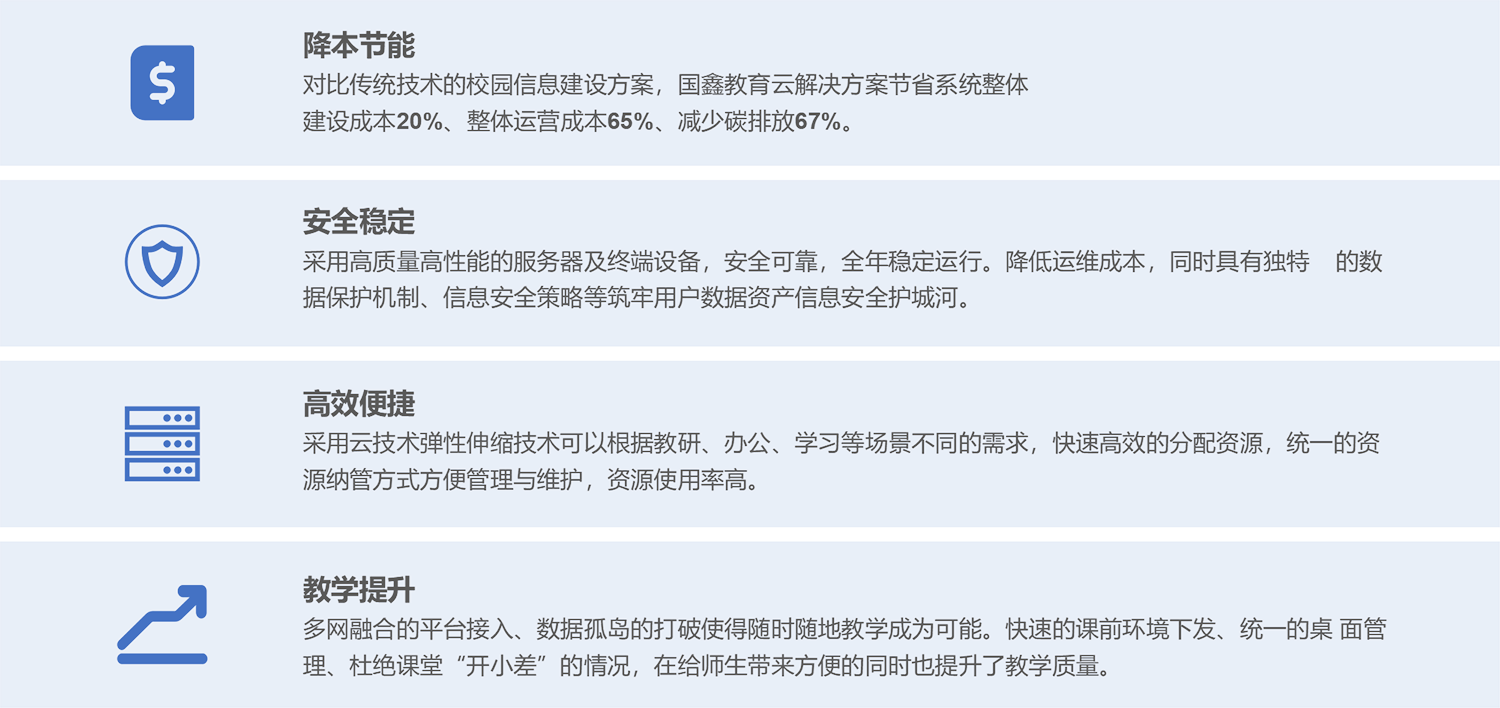 dcbox小金库教育云解决方案是针对教育业现状及遵循政策指导方向,采用自研国产硬件及自研软件平台,推出的教育行业云平台方案。方案基于云计算技术、互联网+战略格局、契合融合创新的思路,助力校园智慧建设,更好地为教育改革和开展给予信息化基础环境支撑。