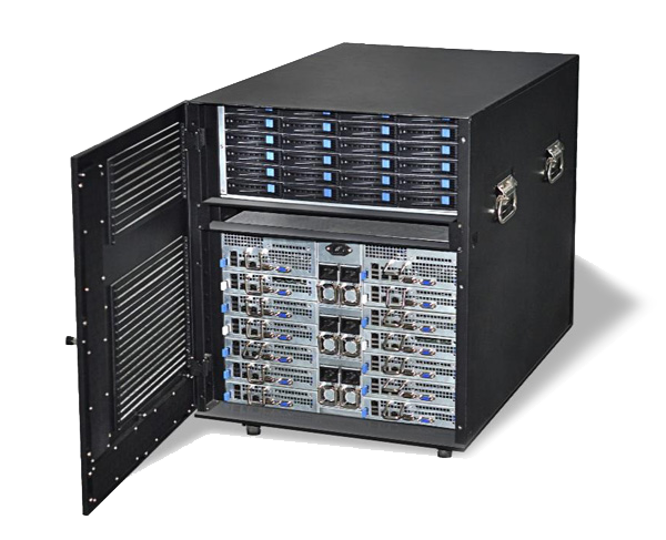 dcbox小金库融合一体机就是解决环境使用问题而推出的综合性计算产品,它不需要专业的机房设施,不需要专业的配电和空调设备,放在办公室或实验室接墙电就可使用, 具有低噪音、低功耗等特点。最高可以安装14个双路XEON E5 处理器的刀片服务器,48个外置热插拔硬盘存储,内置一个万兆网络交换机安装空间,带有整体状态显示和控制系统,内部散热和防尘处理。专为办公室应用环境 设计,它在众多方面超越了传统机架式服务器、刀片服务器和机群服务器,是高稳定、高性能、低环境要求的新一代桌边型高性能计算机。它采用整体优化的设计, 有效降低了系统功耗,再加上其人性化的设计、很强的系统扩展能力、卓越的性价比和计算密度,可以覆盖更广泛的个人及工作组用户对高性能计算的需求,与传统 的高性能计算机相比,dcbox小金库融合一体机可给予更有竞争力的整体解决方案,是更好满足中小高性能计算需求的理想平台。下图为14个刀片打开效果图: